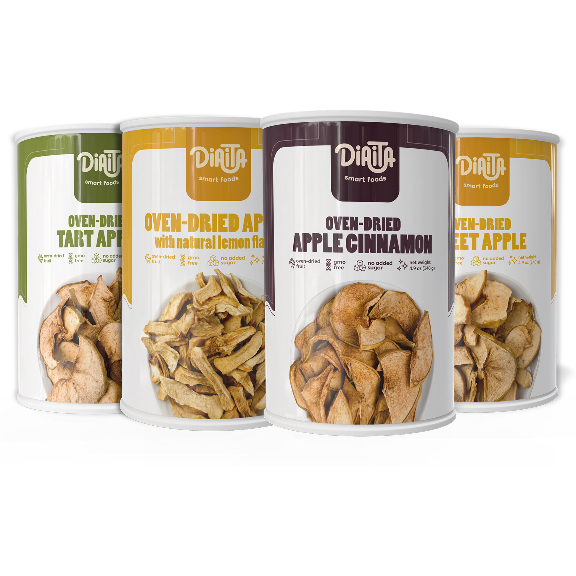 Vier köstliche Sorten in einer Box: Golden Sweet, Granny Smith Tart, Apfel-Zimt und Zitronengeschmack. Alle Äpfel werden schonend im Ofen getrocknet und in praktischen Großdosen verpackt.